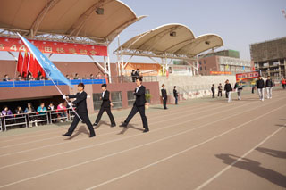 上午8時(shí),伴隨著運(yùn)動(dòng)員進(jìn)行曲明快激揚(yáng)的節(jié)奏,儀仗隊(duì)、裁判員代表隊(duì)、各班級(jí)運(yùn)動(dòng)員、教師方隊(duì)依次入場。