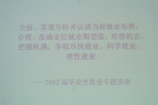 2012年3月20日下午,學(xué)院在交通樓J311教室舉辦《全面、客觀分析并認(rèn)清當(dāng)前就業(yè)形勢(shì),合理、準(zhǔn)確定位就業(yè)期望值,珍惜機(jī)會(huì),把握機(jī)遇,爭(zhēng)取盡快就業(yè)、科學(xué)就業(yè)、理性就業(yè)》的專題講座。學(xué)院各系學(xué)工辦主任(團(tuán)總支書(shū)記),2012屆畢業(yè)班全體班主任以及2012屆未就業(yè)畢業(yè)生共300余人聽(tīng)取了講座。