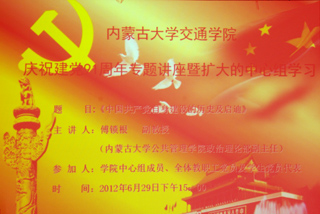 2012年6月29日下午,交通學(xué)院在交通樓A351會(huì)議室舉辦慶祝建黨91周年專題講座暨擴(kuò)大的中心組學(xué)習(xí)會(huì),邀請內(nèi)蒙古大學(xué)公共管理學(xué)院政治理論部副主任傅鎖根博士作了題為《中國共產(chǎn)黨自身建設(shè)的歷史及啟迪》的專題講座。 學(xué)院院長柴金義 公共管理學(xué)院政治理論部副主任傅鎖根博士 學(xué)院常務(wù)副院長董平 學(xué)院黨委副書記、紀(jì)委書記白托婭 學(xué)院副院長孫恒 會(huì)場 會(huì)場 會(huì)場 會(huì)場 會(huì)場 會(huì)場 會(huì)場